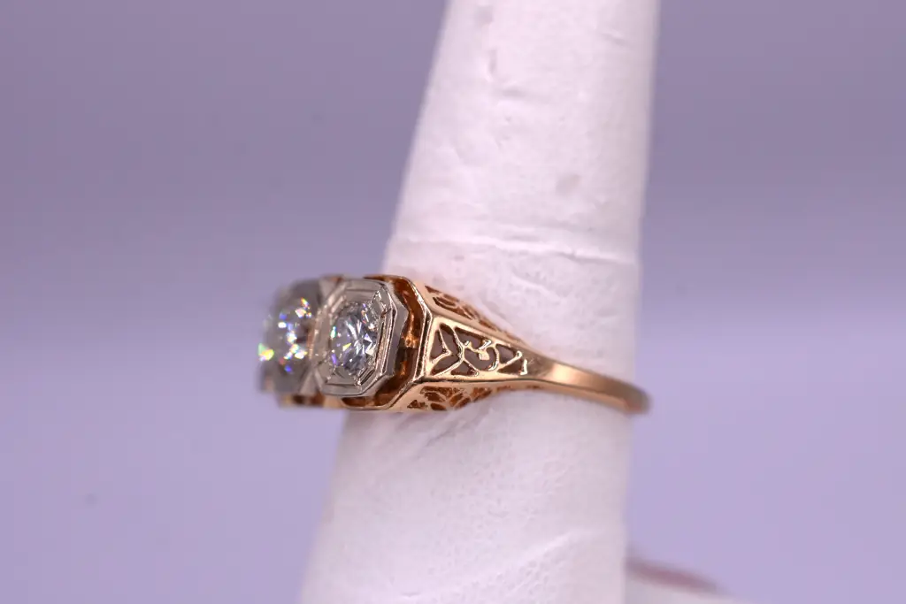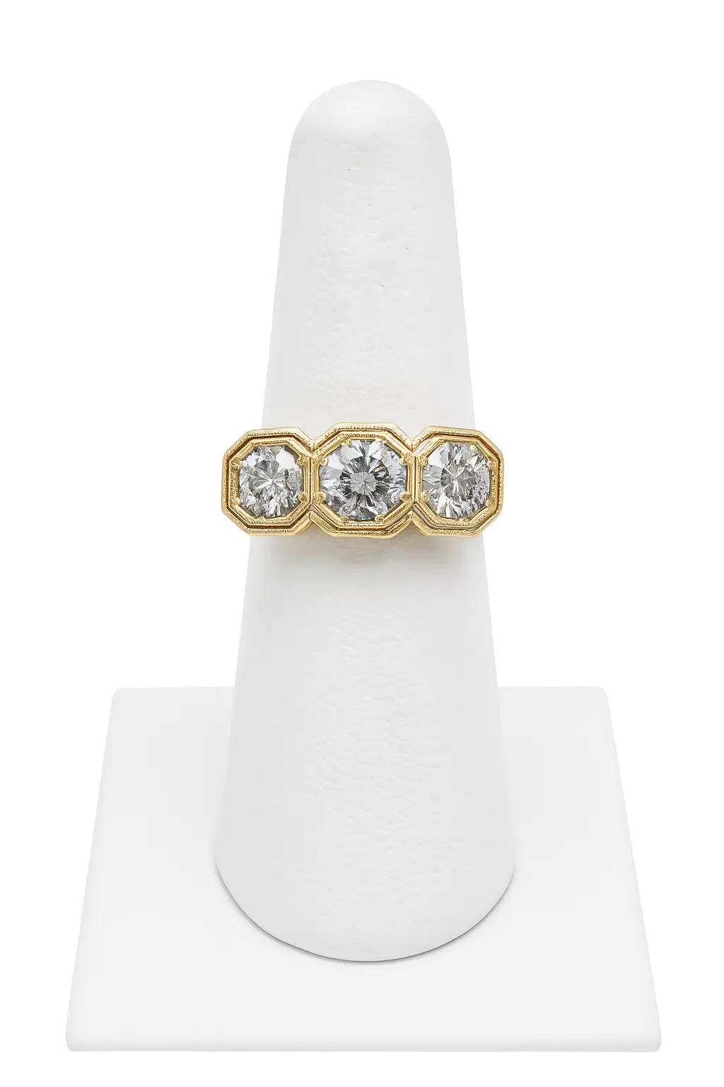 Antique, Art Deco-style Ring, features three Round Brilliant Cut Diamonds set in a horizontal row. Each diamond is nestled within a platinum, octagonal bezel-style setting, framed by fine milgrain detailing that enhances the antique character of the piece. The symmetrical layout and geometric frames give it a classic Art Deco feel. The diamonds exhibit strong brilliance and are set in 14K yellow gold, providing a warm contrast that further accentuates their sparkle. This elegant design exudes timeless sophistication, perfect for adding a refined vintage touch to any ensemble. TCW: 1.0 VS2G