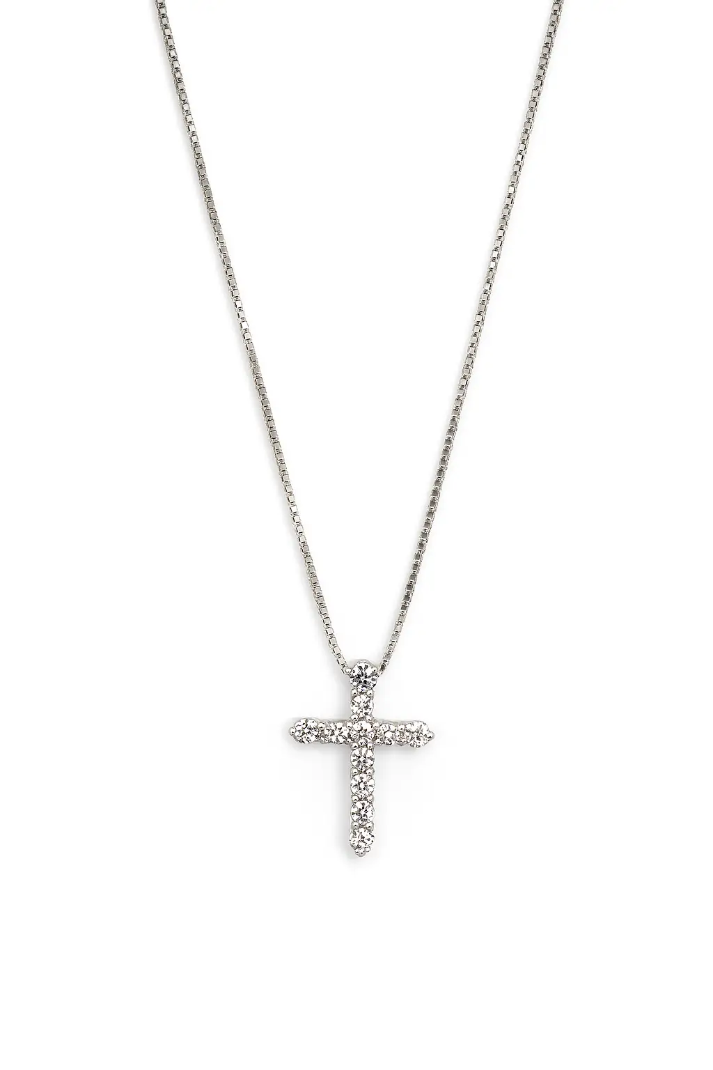 Diamond Cross Necklace crafted of 14K White Gold and Box Chain. TCW: 1.05VS1GH