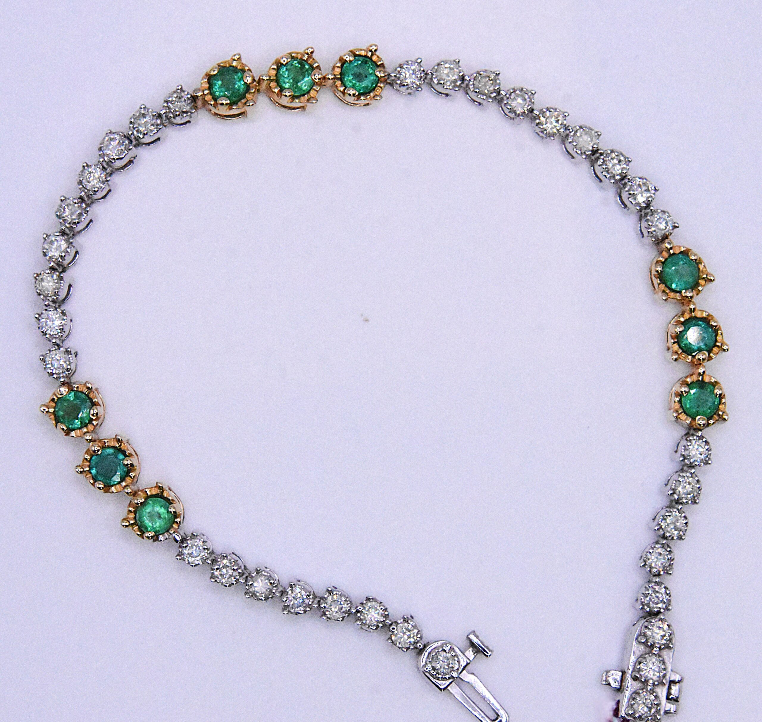 This emerald and diamond tennis bracelet is crafted in 14K white and yellow gold, featuring natural round emeralds (1.45 CTW, F1 clarity) and sparkling I1 diamonds (1.65 CTW). A heavy, well-made design with a timeless look, perfect for everyday luxury or special occasions.
