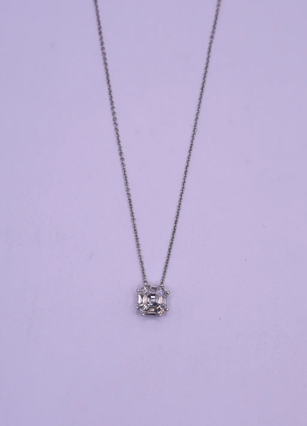 Natural Puzzle Diamond Necklace crafted of 14K White Gold comes with Link Chain (16″ – 20″ chain option) secured with pear-shaped lobster clasp. Diamond TCW: 0.47 VVS1G. Total Wt: 2.08gr.