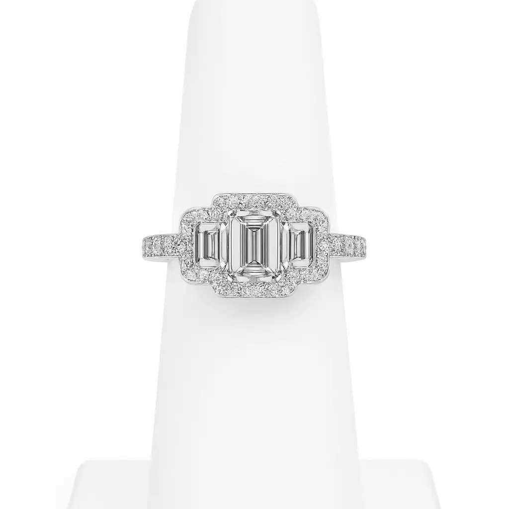 Rare, internally flawless Triple Emerald-Cut Diamond Ring crafted in 14K White Gold. This elegant white gold ring features a stunning, flawless trio of emerald-cut diamonds. The geometric arrangement is beautifully framed by a halo of smaller round diamonds, adding brilliance and symmetry. Set in polished 14K white gold, the ring sparkles with extra, natural diamonds for a timeless, luxurious look embracing the past, present, and future. Ideal as an engagement ring or anniversary gift, this ring exudes sophistication and vintage glamour. TCW: 1.83 GIA-Certified.