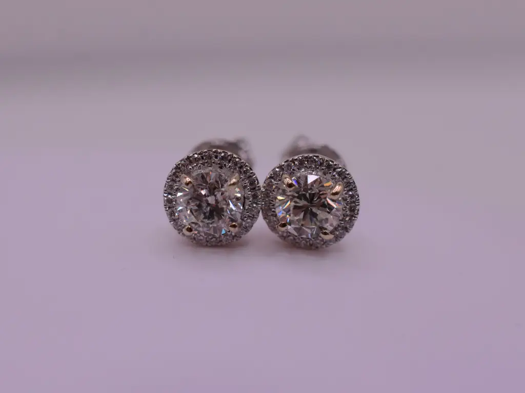 Classic elegance meets radiant sparkle in these Round Brilliant Cut, Natural Diamond Halo Earrings. Each earring features a dazzling center natural diamond encircled by a shimmering halo of smaller natural, accent stones, enhancing brilliance and creating a timeless silhouette. Expertly crafted in lustrous 18K white gold, these earrings offer a luxurious look that transitions effortlessly from day to night.18K TCW: 1.30 SI2F/G
