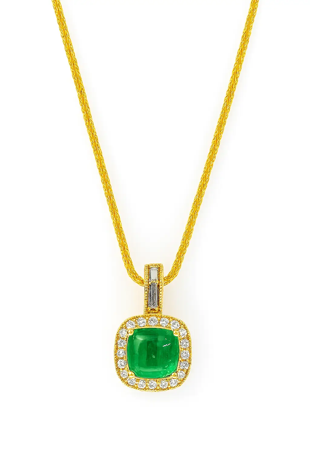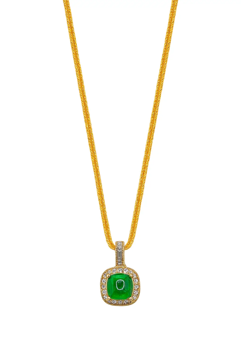 Natural, Sugarloaf Emerald surrounded by Halo of Diamonds with Baguette Diamond at Bail. Custom-Crafted Vintage piece. Italian Spiga Yellow Gold Chain.