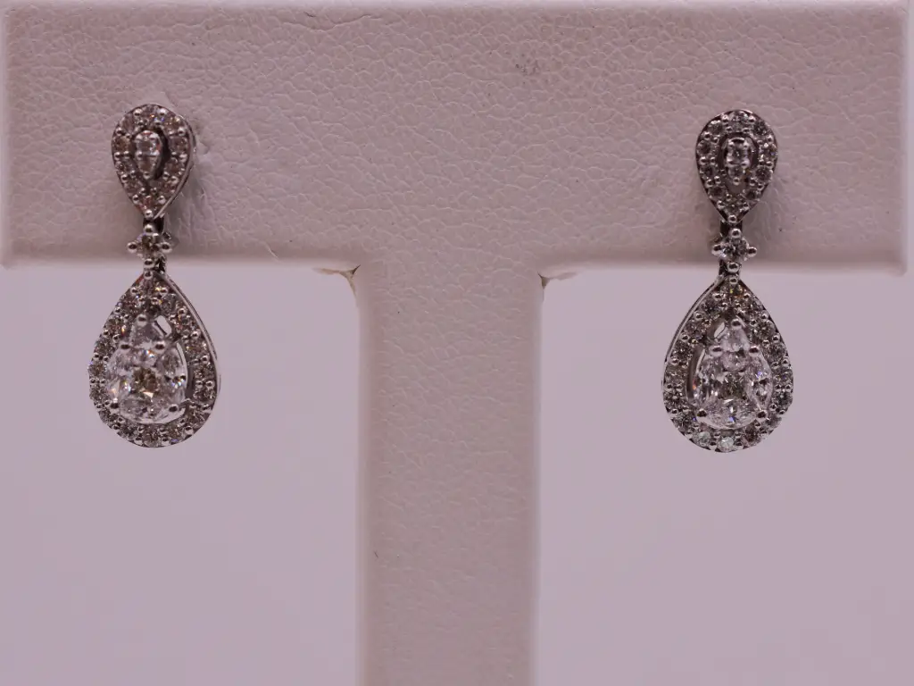 Graceful and glamorous, these teardrop halo diamond dangle earrings are the perfect blend of vintage charm and timeless sparkle. Each earring showcases a stunning pear-shaped natural diamond cluster centerpiece, framed by a halo of vivbrant, natural brilliant cut round diamonds for added radiance. Set in polished 14K white gold, the intricate design continues up the drop with a diamond-accented loop, creating a sophisticated silhouette that moves beautifully with every step. Diamond TCW: 0.75 HSI1